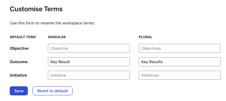 By default, Tability uses the terms Objectives, Outcomes, and Initiatives. You can easily change these to Objectives, Key Results, and Initiatives if you use OKRs.