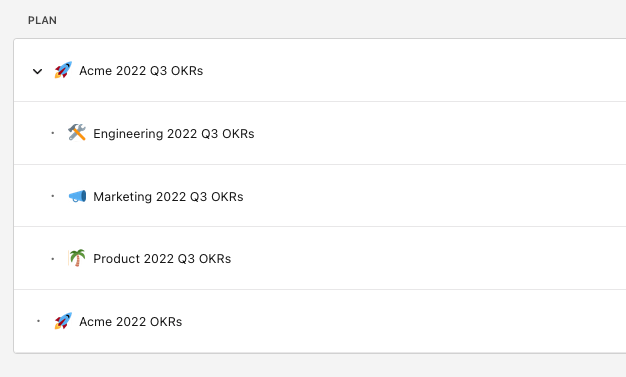 This is the recommended plans structure for a company with a yearly OKRs plan that is broken down into quarterly OKRs for the company and the teams: