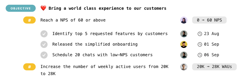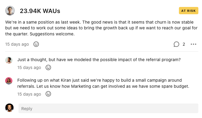 It's the missing link between your KPIs dashboards and your project management tools, and it will help you drive execution by putting the goals front and center. No more getting out of the loop or losing track of the top priorities—our platform will keep everyone in sync.