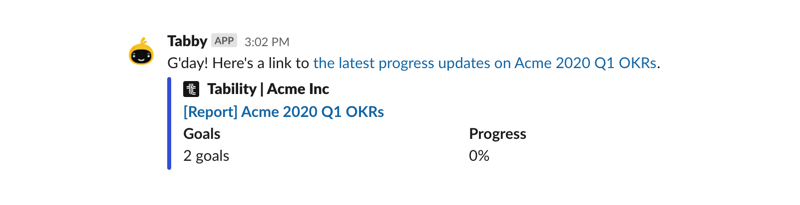 You can connect Tability to Slack to get weekly reminders and reports in the channel where your team works. You can focus on your work, and we'll nudge you when it's time to share progress, or when new updates are available.