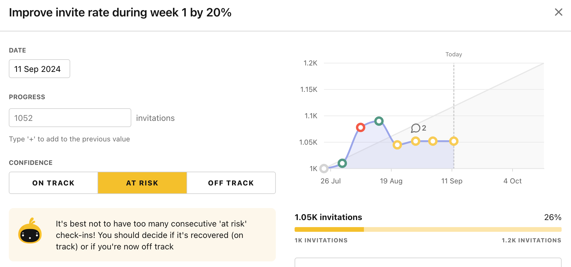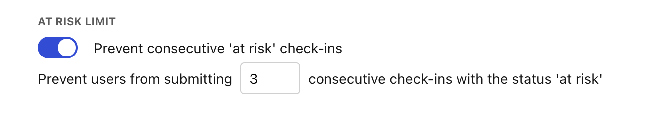 This new feature will automatically stop your team from setting the confidence level to yellow (at risk) too many times in a row. By default your team will get a warning on the third consecutive check-in, but you can set this to how every many consecutive check-ins as you'd like.