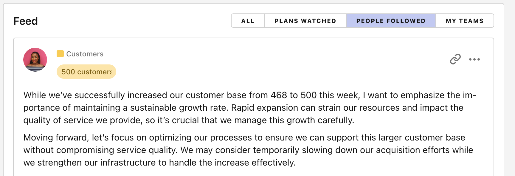As teams scale, keeping up with status updates can feel like drinking from the fire hose. A simple way to fix that is to give you more options to reduce the noise by focusing on the plans, people, and teams that matter the most to you.There are now 2 more filters available in your focus feed. You can now: