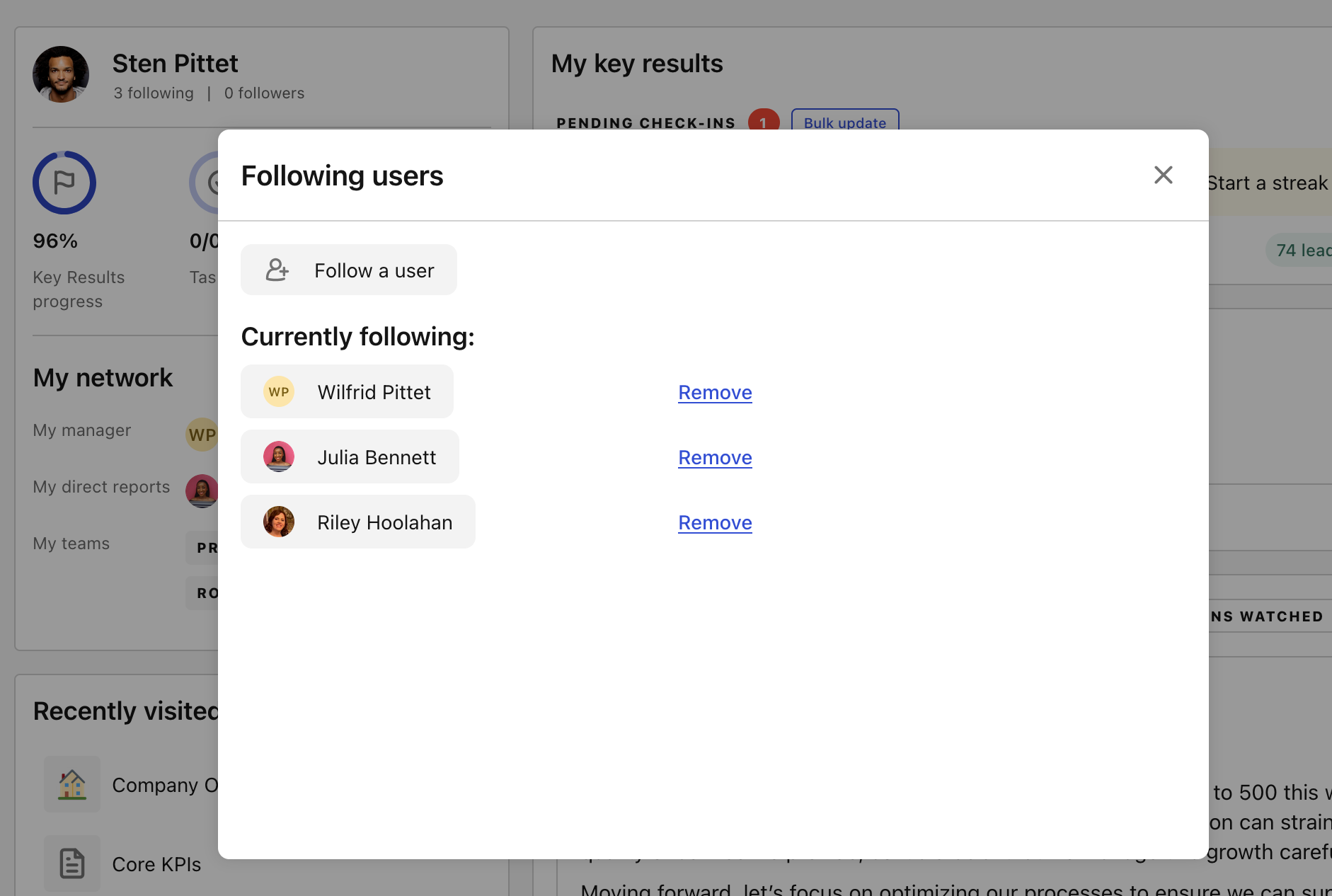 Following users will allow you to filter status reports and notifications in various places. For instance, you'll be able to filter check-ins from:
