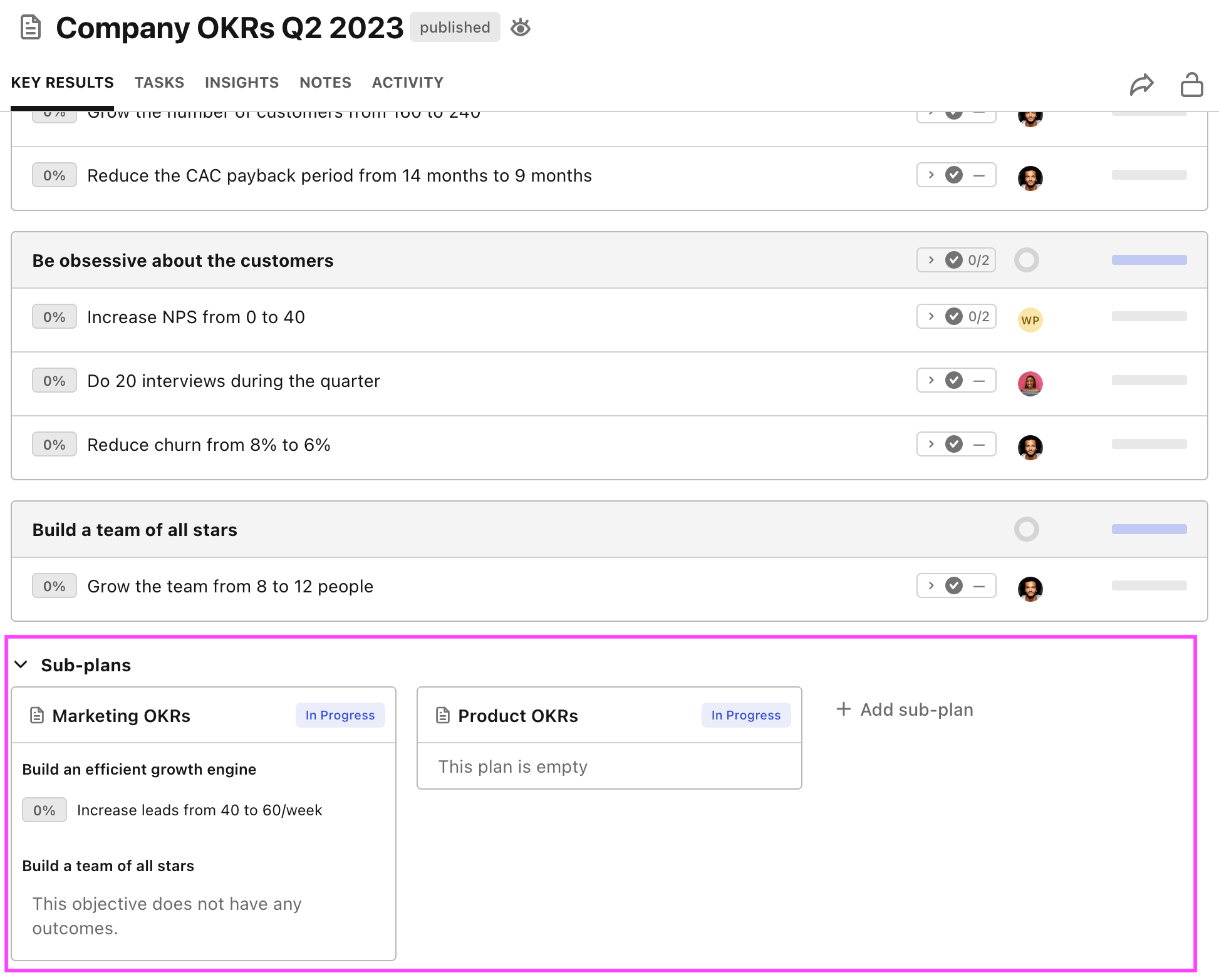 You can now see all the sub-plans with their goals at the bottom of the outcome/key results view of your plan.
