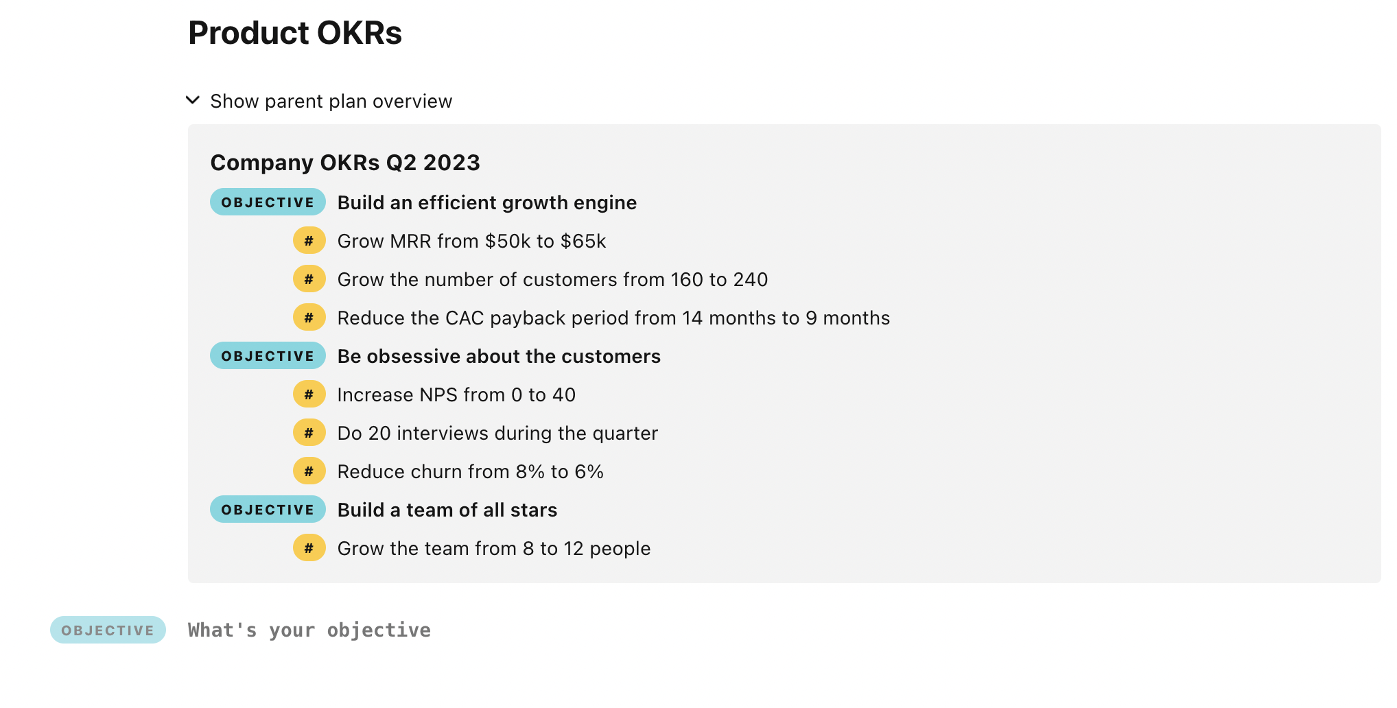 Aligning OKRs is all about having the right context. This means that you often need to refer back to the parent plan to make sure that your OKRs are contributing to the right goals.