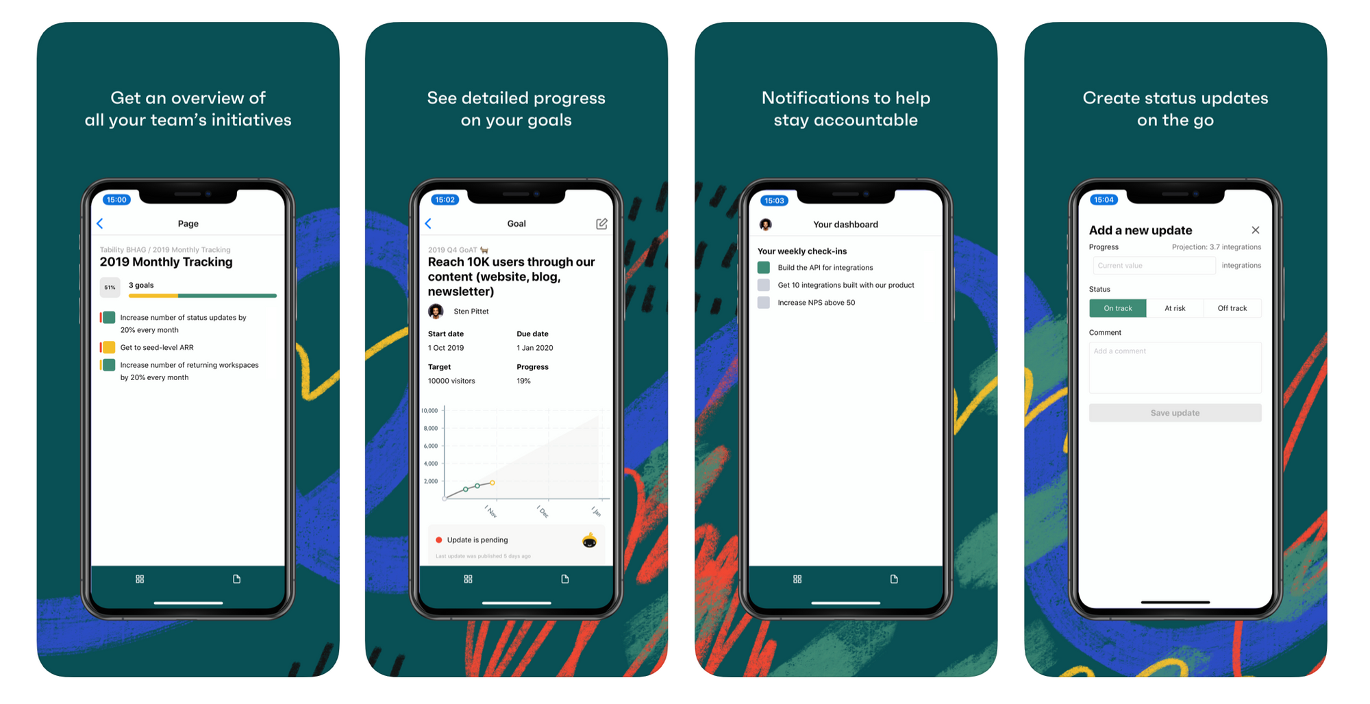 As a contributor or team member, you can check in and do all of your updates on your way into to work in the morning. You could even stop at your favorite cafe on the way to work, and stop to have a cup while you update your goals on your phone.
