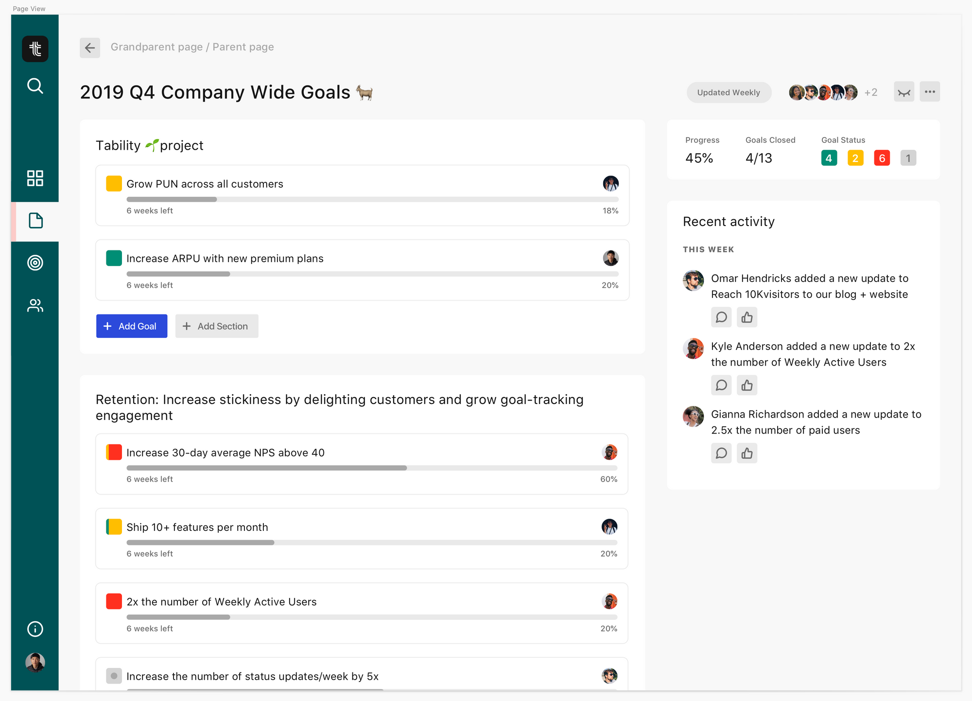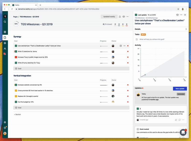 Now you can see the same goal design on your web app, as you will on your mobile and tablet as well. We're applying this same flexibility-first mentality to every component - pages, goals, updates, etc. - and you'll soon be able to open your Tability workspace anywhere on anything.