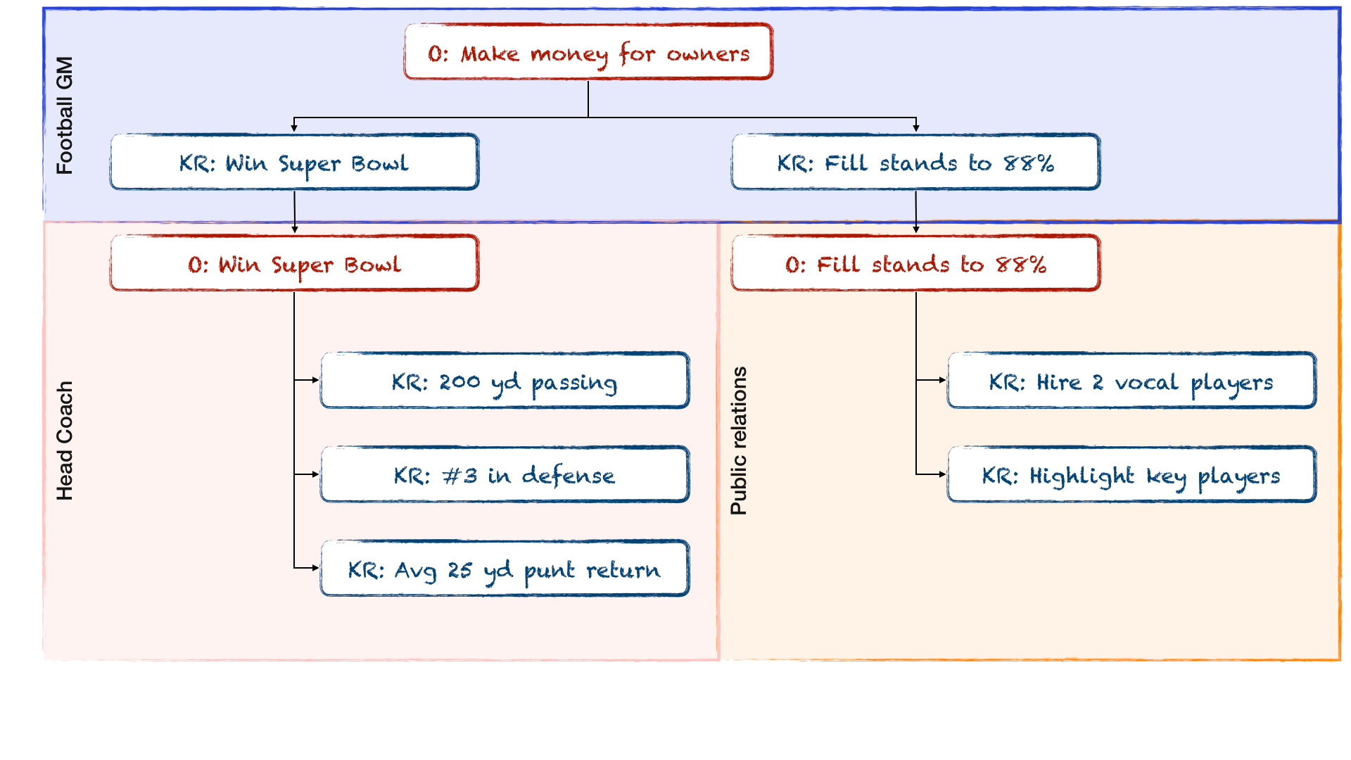 The GM's Key Results trickle down as Objectives for the Head Coach and PR office. In turn, they will see their KRs trickle down into further Objectives. In the end, you'll get a picture similar to the one below.
