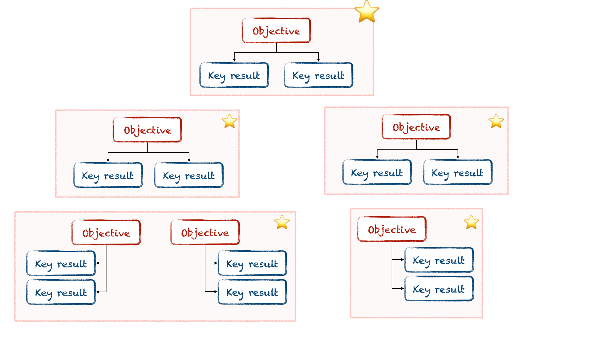 It may look less structured since you won't have the same planning view, but it's more efficient in practice. Once the company OKRs have been decided, everyone can start looking into how they can contribute at their level. Rather than putting strict rules on the relationships between levels, you focus on making sure the plans align with the North Star.