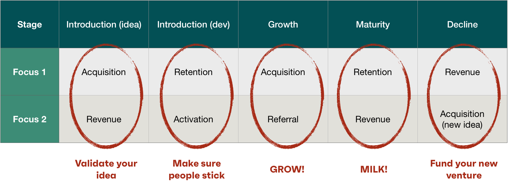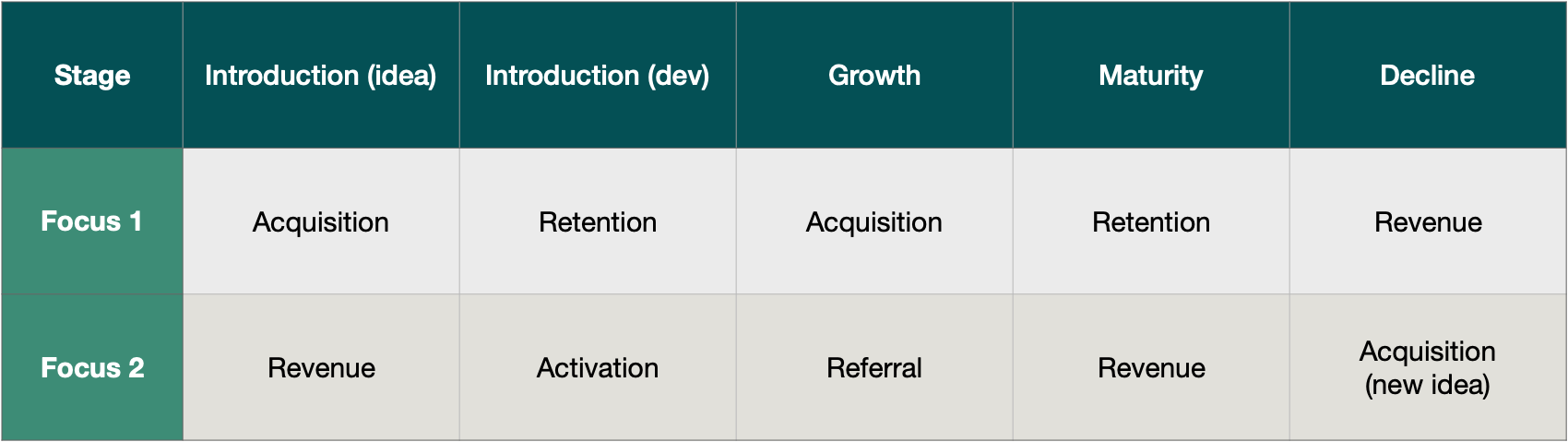 Well, we're going to pick 2 parts of the AARRR funnel to focus on at any point of the product lifecycle.