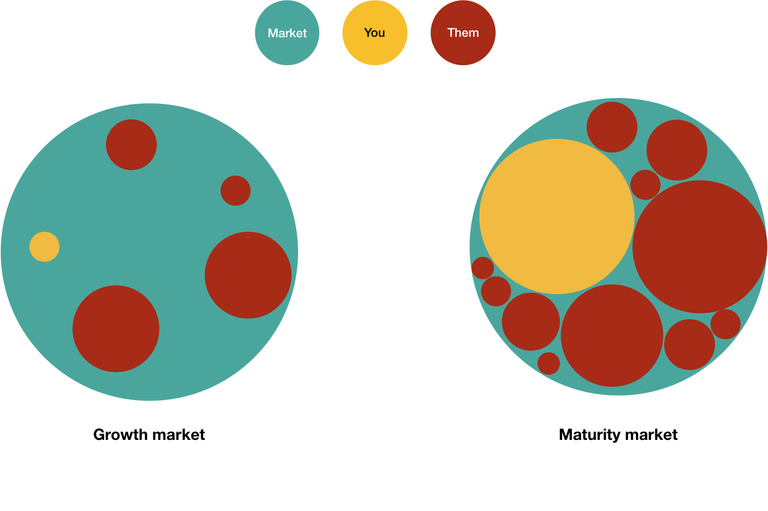 Hitting Maturity is a scary thing. It means that your market is saturated and competition will intensify. In a Growth market, there's enough room to play that you don't really have to worry - there are thousands of customers that you can reach.