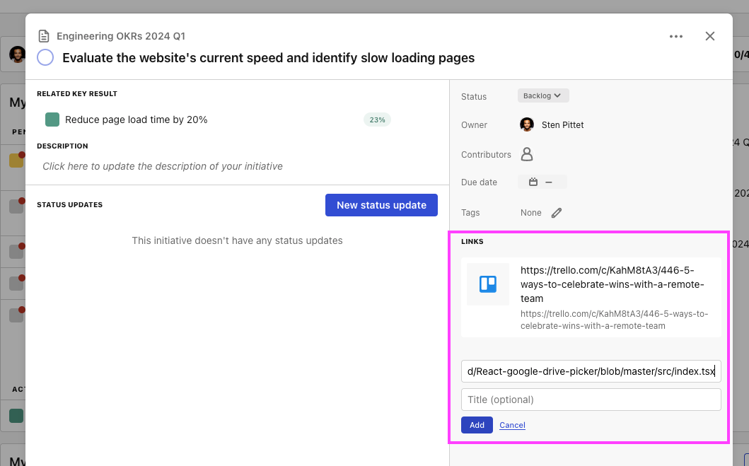 We've added the support for links in initiatives! You can now link to external resources that will support the work you need to do on the initiatives. Simply click on a task or initiative, and add a link to the Links panel.