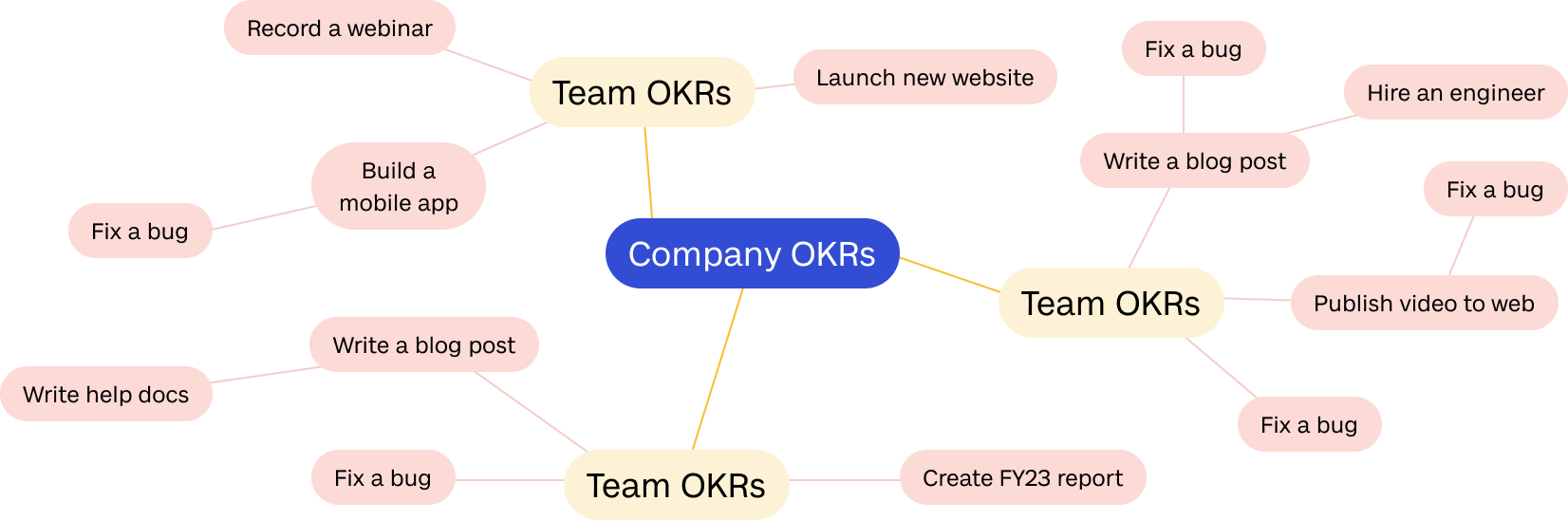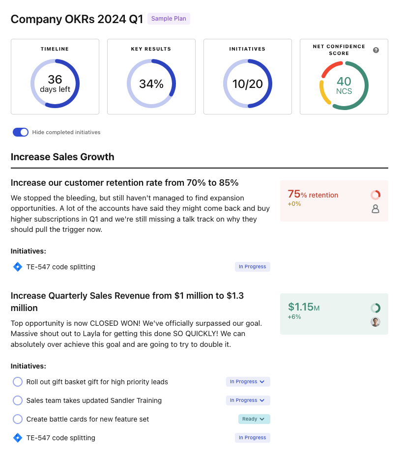 The OKR framework helps lay out the strategy in a way where you can see, contextually, how things are progressing, who's involved and what's being done about it. It provides great transparency into your entire org on what people should and are working on. Objectives → Key Results → Inititatives (or projects) are all laid out neatly so everyone knows what to do and where everything needs to be.