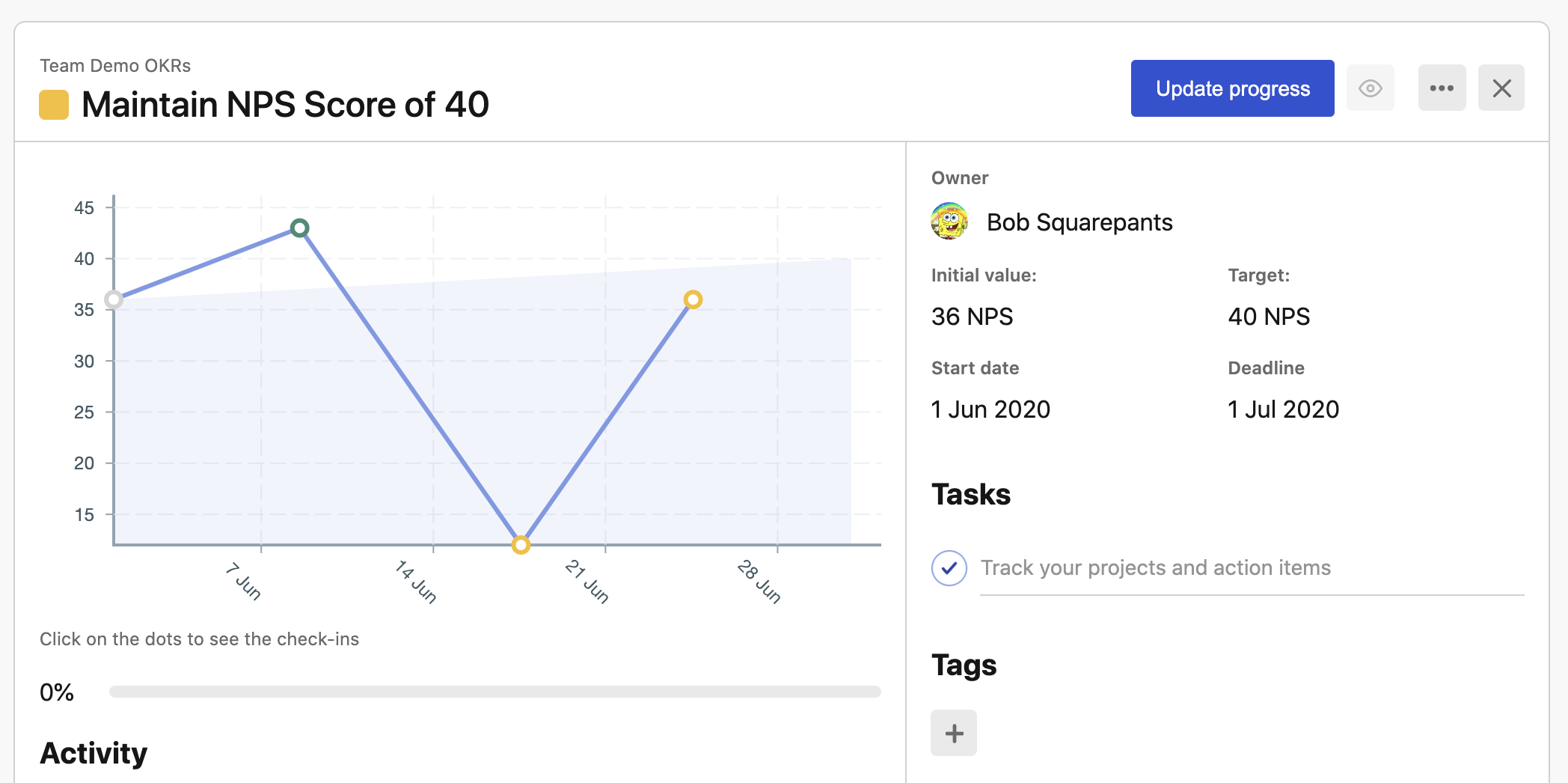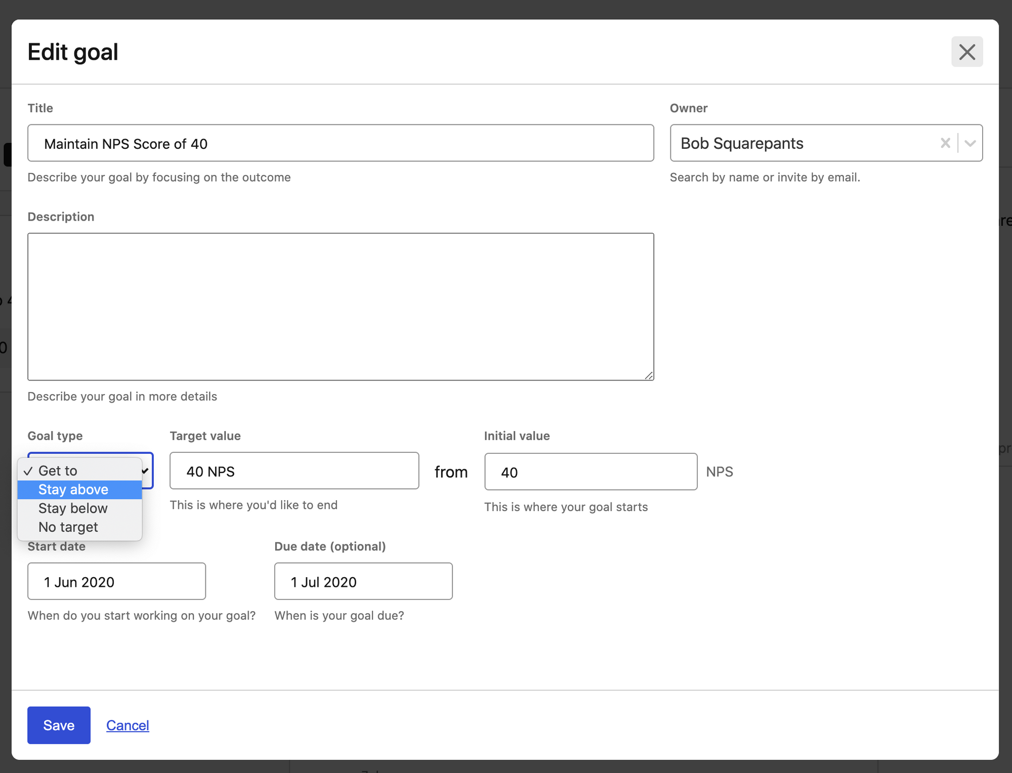 Now we can set in Tability what kind of metric it is. One new goal type is "stay above" which will measure the percentage of a target value. So if you have 36 of 40 NPS, your progress will show 90% instead on 0%.