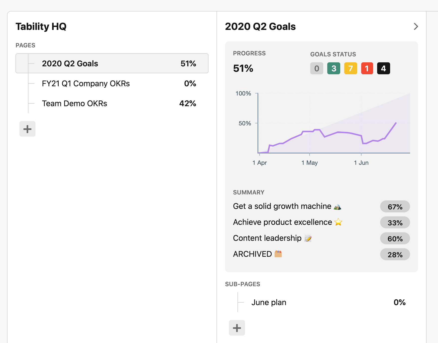 Charts and graphs are a powerful thing. Seeing progress and trends are always an easy way to dissect a set of information. Now every page has an overall progress chart, that measures how the page as a whole is progressing, over time.