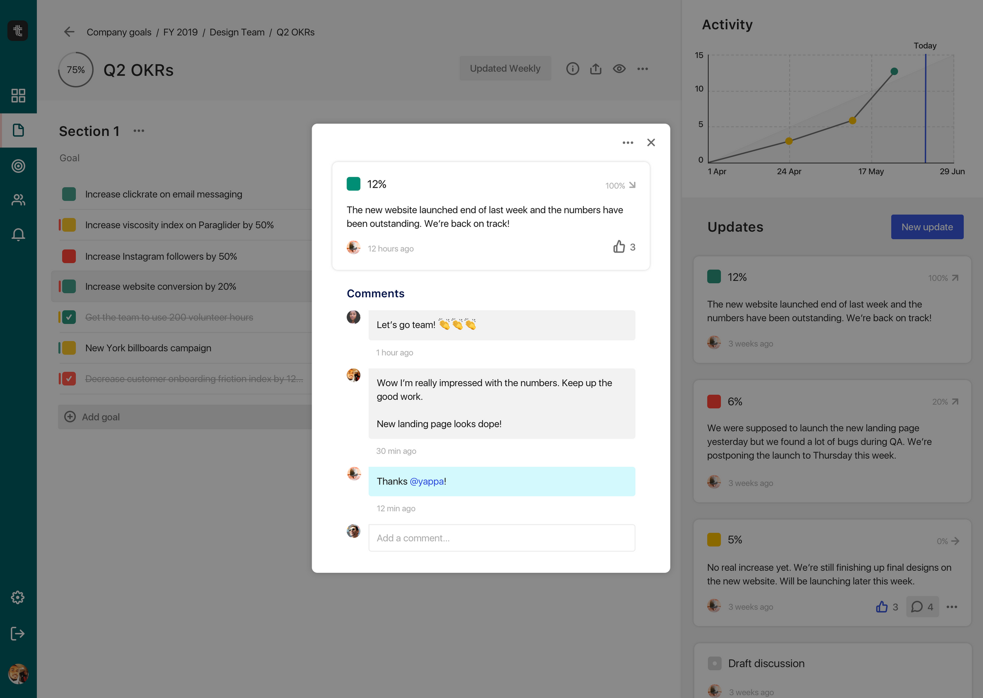 Now, you can comment on a goal before it even starts. If you're in a manager role, you can review your team's goals before the start date and discuss whether it can be better or not, or approve it with a simple "👍." All your discussion and tracking is now in one place, in context.