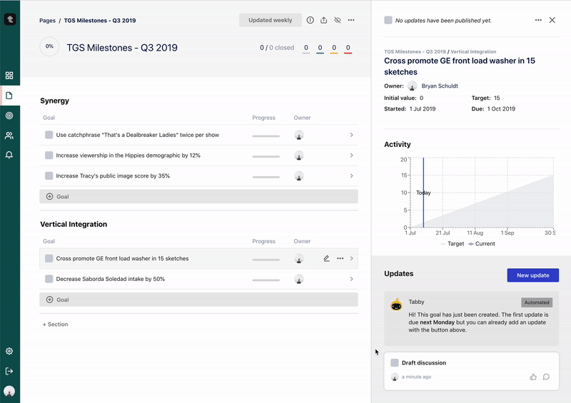 So you may have noticed some big face-lifts in some of the product UI over the past week or two. As we were approaching the end Q2 and we were beginning our planning for Q3, we noticed some key features missing. There was no where for us to discuss or review our upcoming goals. The only way you could comment on a goal or leave a note was when there was already an update made, which in this case would not happen for a few more weeks (one week after the start of the quarter, theoretically). So we added a feature.