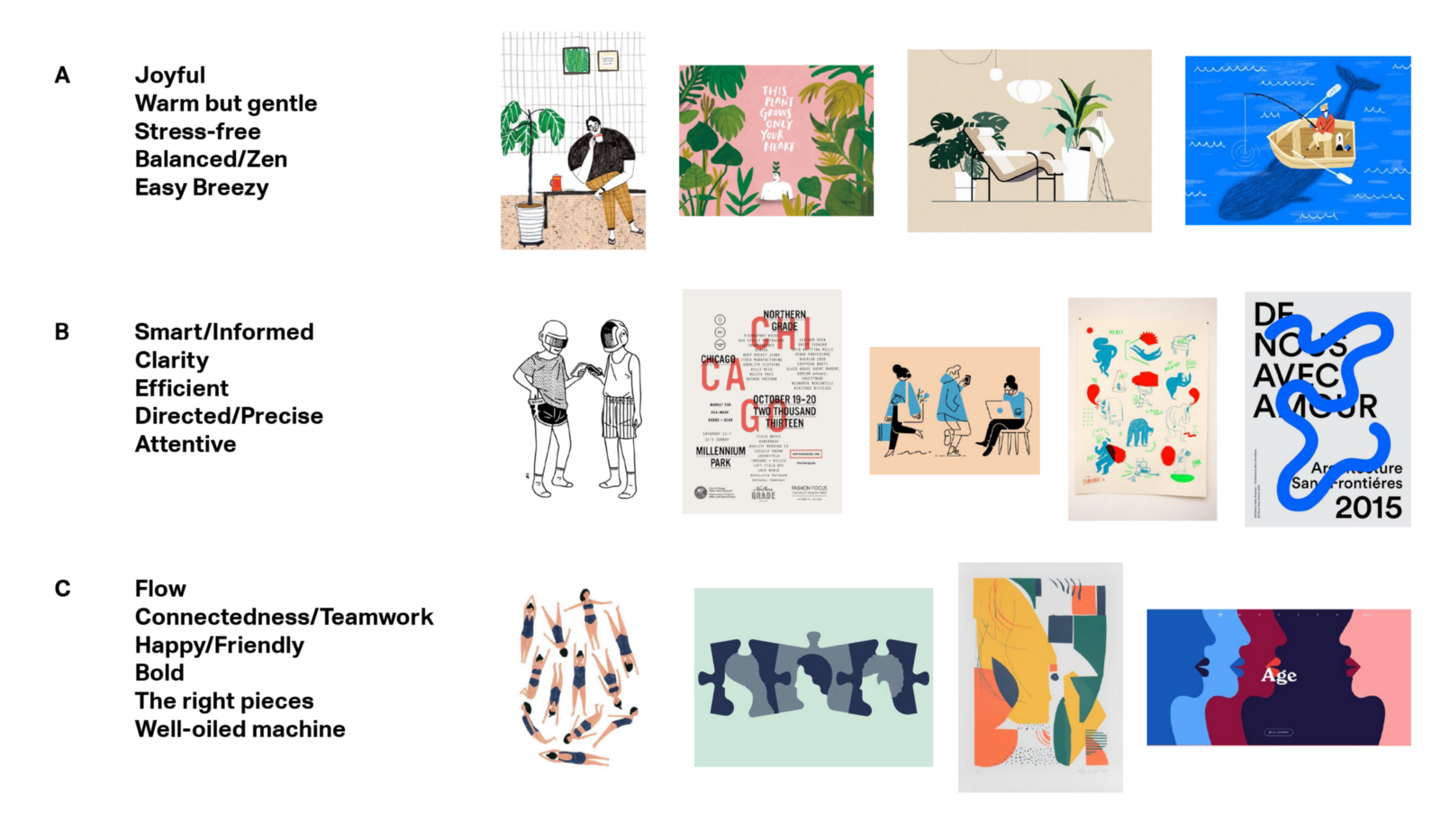 So using what we’ve defined thematically, we can ask ourselves things like “what colors feels right for our brand,” or “how do we express our ideas in one symbol?” “Is tranquility rigid or smooth, is work fast or slow, or both?” And no matter what we were designing, we always point back to our core concepts.