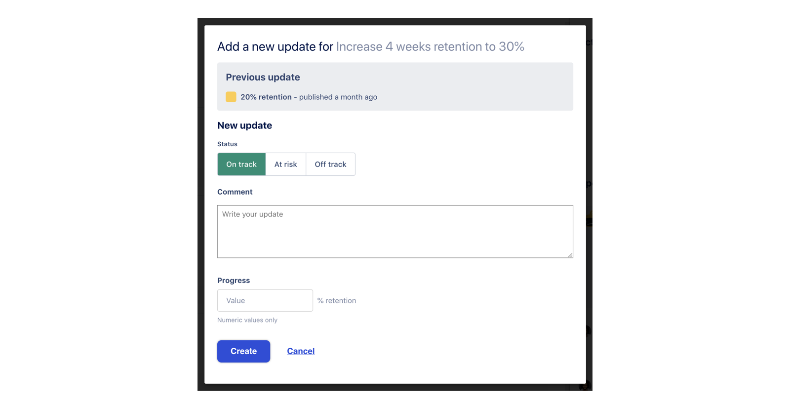 First, we want to make sure that people do not waste time having to fill lengthy forms to share progress. Secondly, keeping updates light makes it easy to read by anyone in the organization. You can easily compare the goals of the Product, Marketing, or Support teams -- just look at their color to know if things are off-track or on-track.