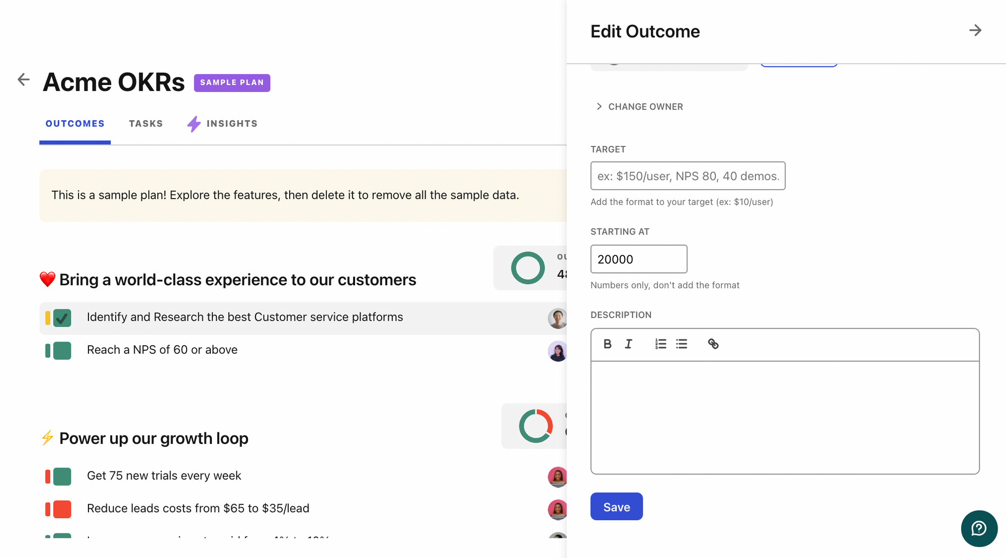You now can add a description to your outcome. Head to your key result, menu and click edit. From there, you will scroll down and add a description. This could be an explanation, executive summary or anything that provides more context on your outcome.