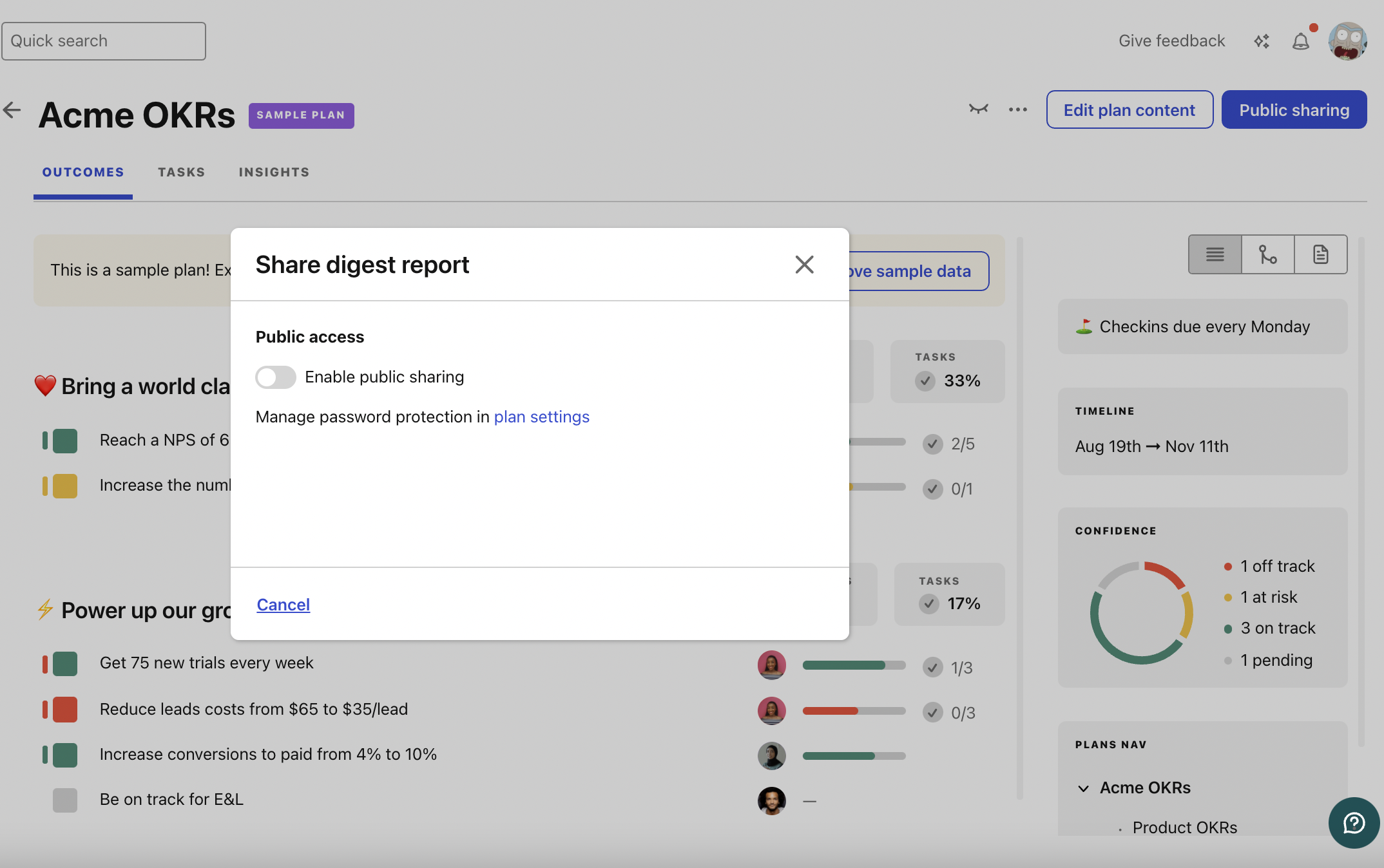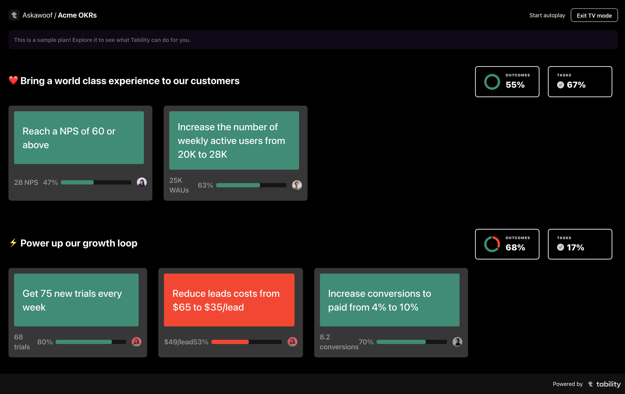 It’s a view designed for large screens, allowing you to see the state of your objectives and outcomes at a glance. You’ll need public sharing to be enabled, and then click on "Enter TV mode" in your plan menu.