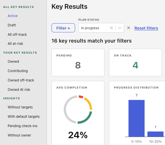 You will find a list of predefined filters in the Outcomes and Initiatives sections of your workspace. These filters will help you isolate items that you care about, but we've also added a new set of filters to provide better insights.For outcomes