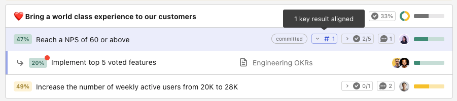 If you're doing OKRs in a larger org, alignment is key. Quite often, you'll have different teams or departments working on related or even dependent metrics. It's important to make sure there is a flexible simple way to connect different key results.