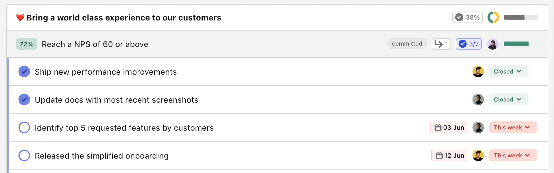 Reforge wrote a great post about their alternative to OKRs: NCTs. Though very similar to OKRs, this methodology includes Tasks in the acronym (some call them initiatives or projects).