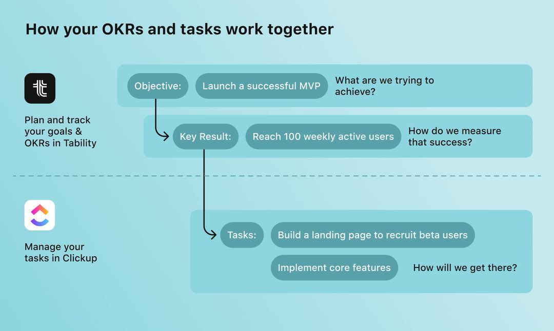 Our brand new Clickup integration helps you connect your tasks to your OKRs so your work is always in context to the goals.