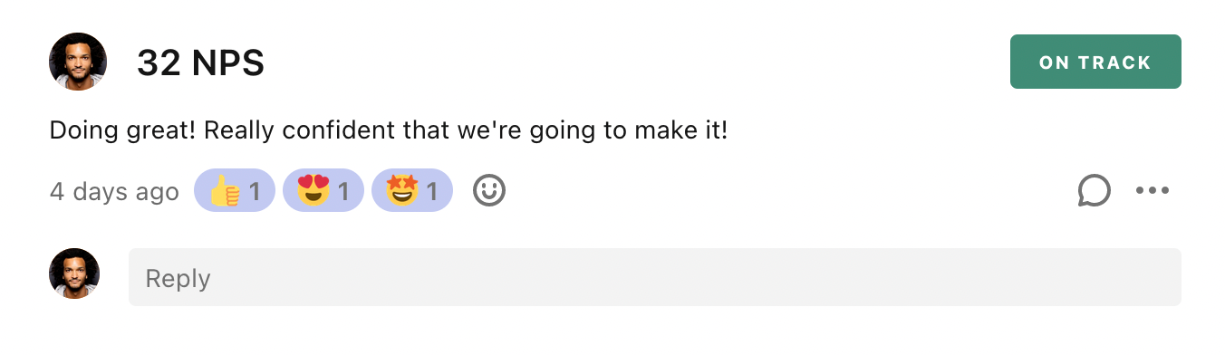 You can now show support to your teammates by adding reactions to check-ins and comments ☺️. It's a nice and easy way to acknowledge the efforts of the team, and it adds a more personal feel to collaboration!