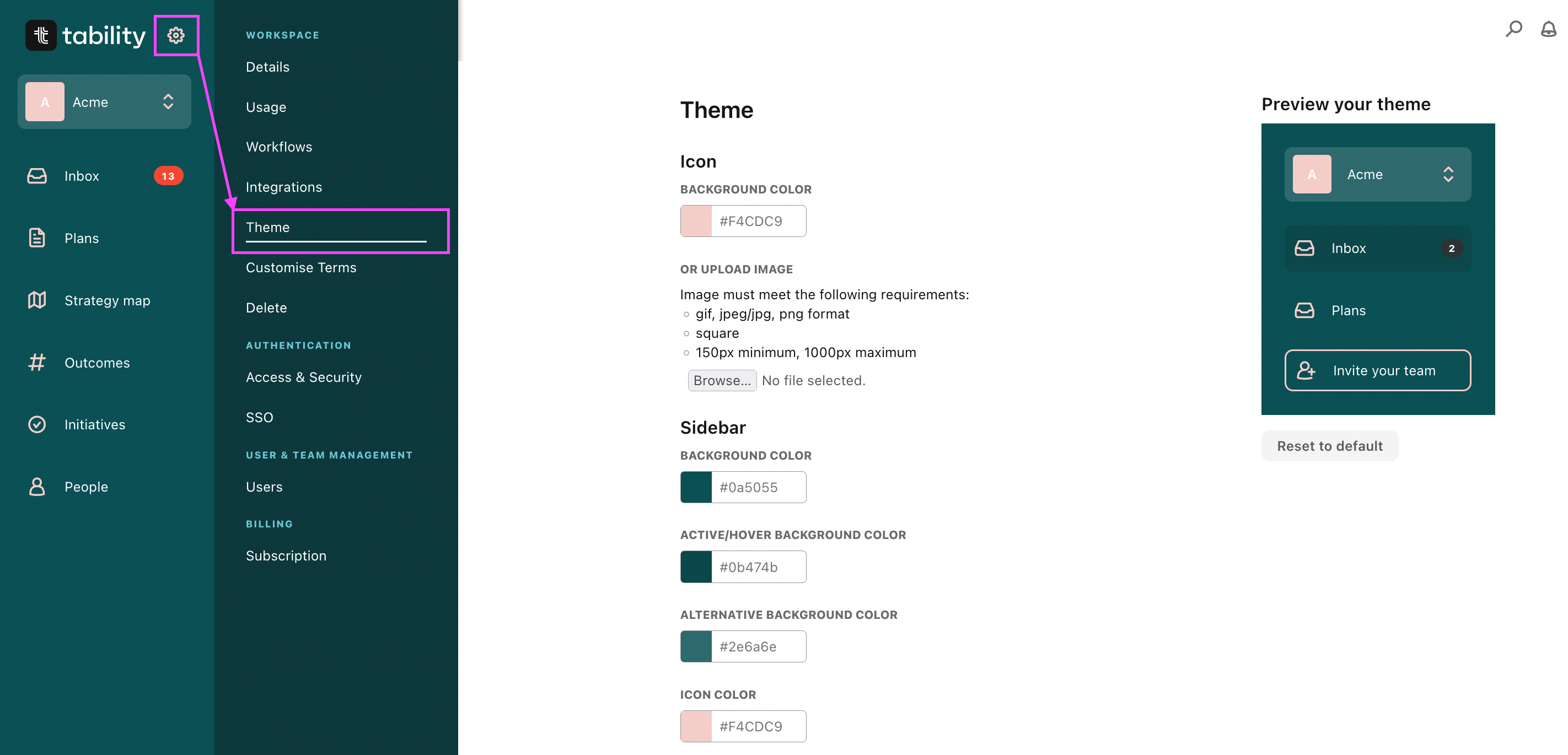 You can now change the appearance of your workspace by going to the Theme admin section of your workspace.You can change the colors of the sidebar, logo colors, or upload your own logo.