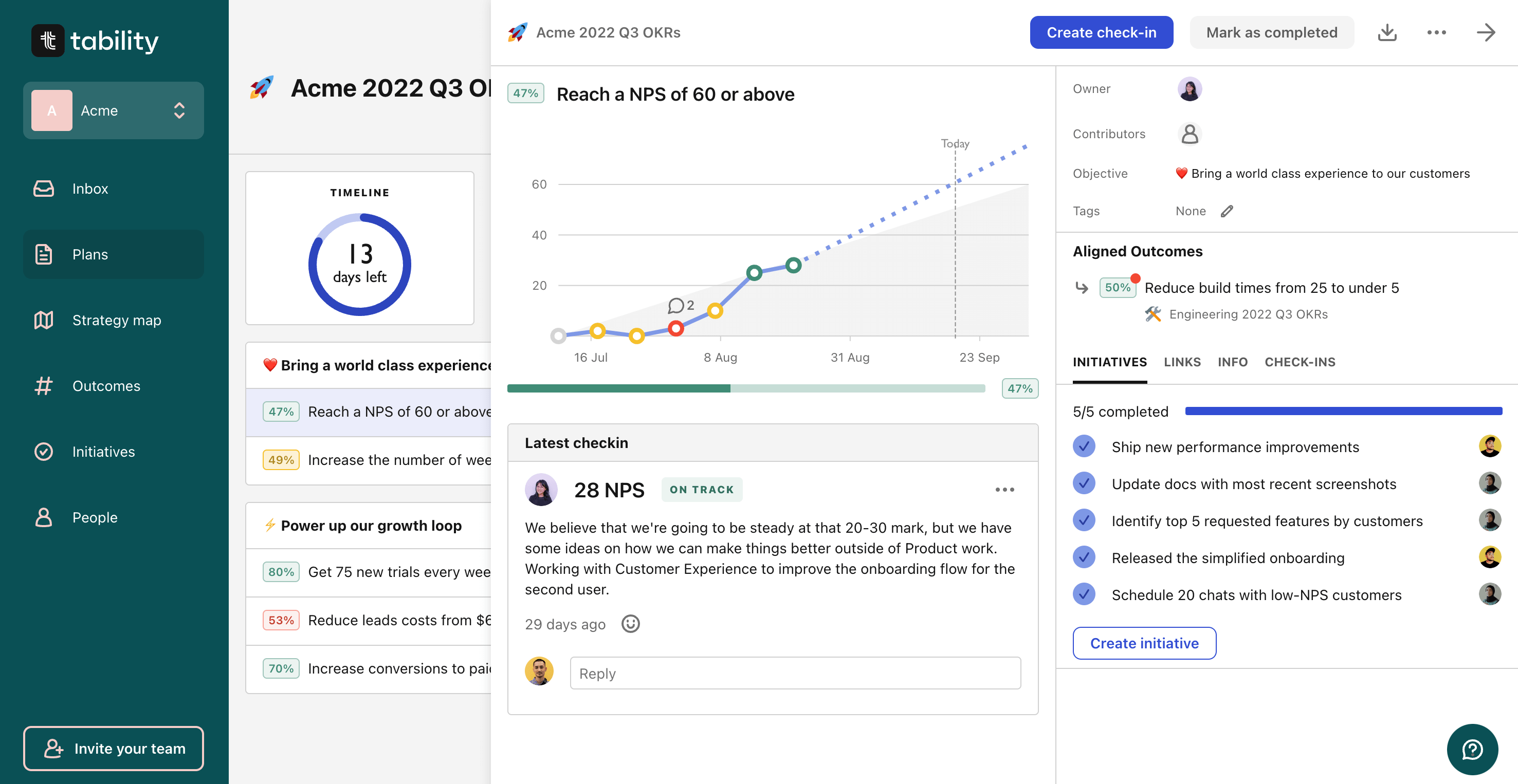You can now find a button to mark outcomes/key results as completed. Marking an outcome as completed will signal to Tability that check-in reminders do not apply anymore.You'll be able to see a tick ✓ next to the outcomes that are completed.