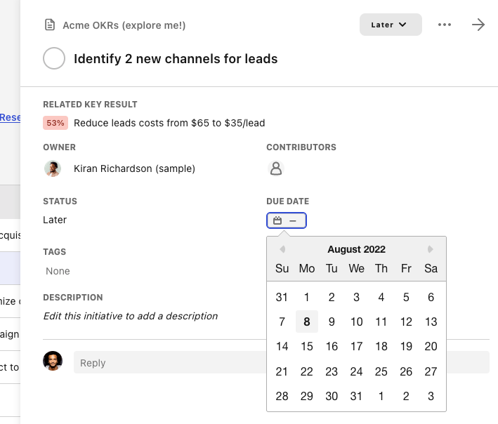 Save time by setting due dates on initiatives right from their detail panel. No need to open up the initiative settings anymore.