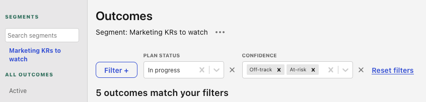 You can now saved your filter selection for outcomes and initiatives as a segment!All the segments you create will be listed in the pre-selected filters nav, and you will be able to search for other segments that exist in your workspace.