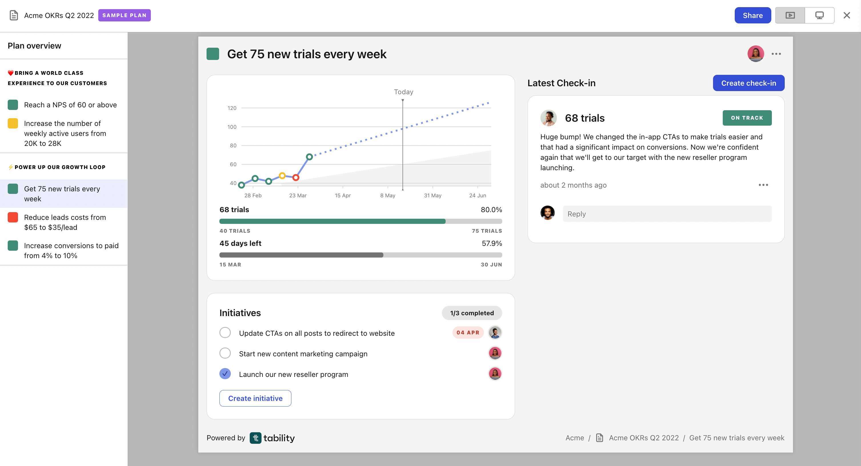 Tability has a brand new presentation mode that lets you navigate your OKRs like a slide deck. No need to spend time re-creating keynotes! You can simply hit the present button to have a slide-like view of your goals and OKRs. Read more 👉