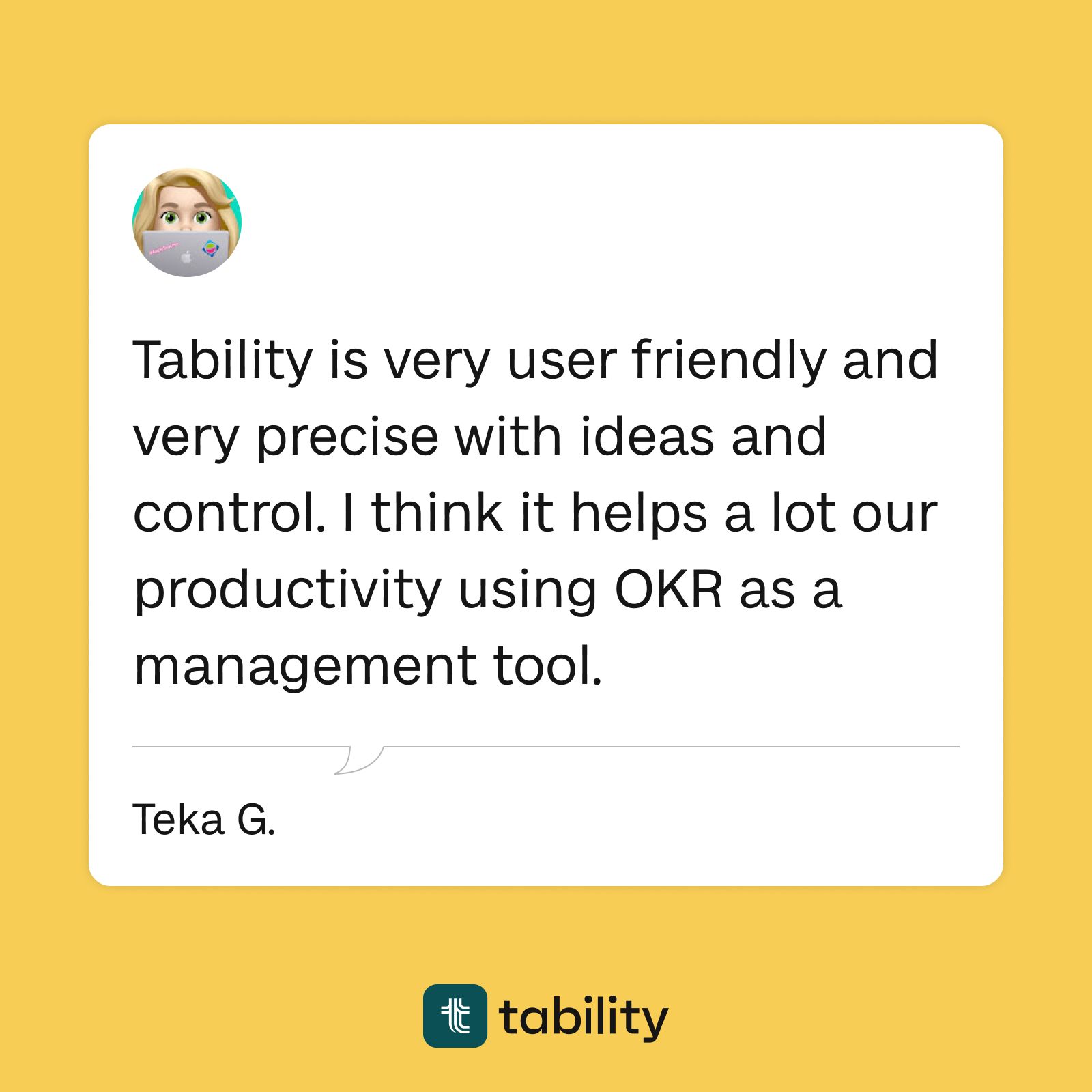 One of our customers, Teka, has found Tability to be a "life saver" — her ability to find the right progress data faster through Tability has saved her time looking for the right progress data. Tability's user friendly interface has made it so her team can stay productive using OKRs as a management tool.