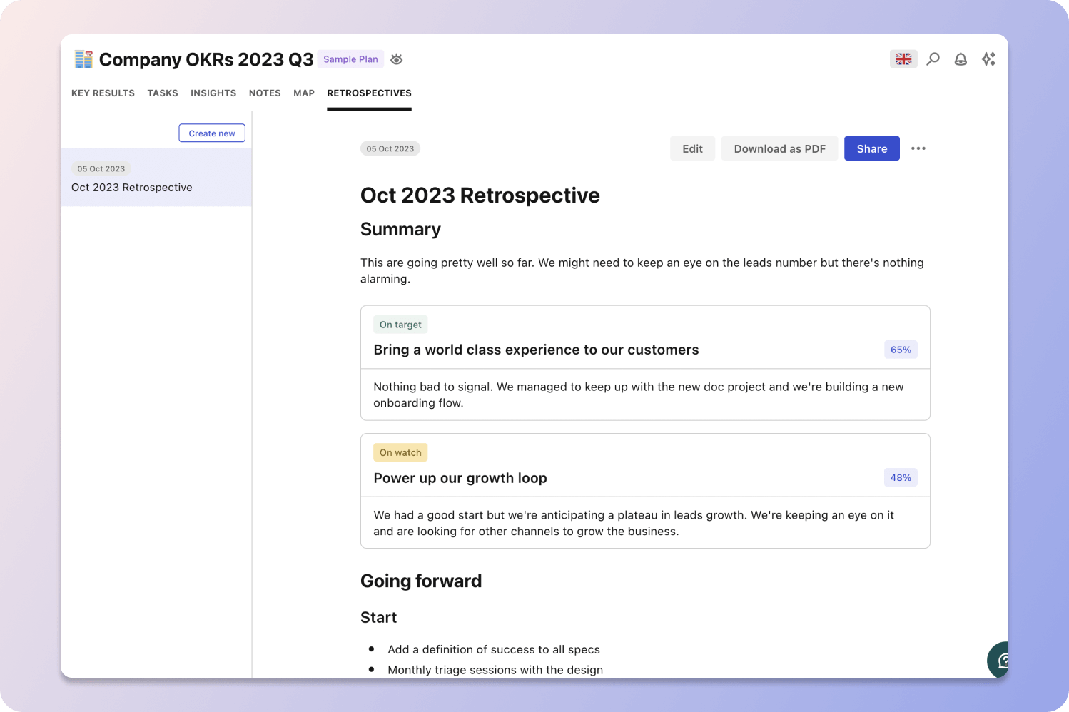 The beauty of this process is the reflective part. At the end of every quarter, or before a new one, you should always run an OKR retrospective. In a retrospective, you're not only sharing your thoughts and dissecting the data, you're also thinking back like "what could we have done better?" You ask yourself if you're actually hitting your goals, what you've accomplished, and whether those goals are still the right ones. It's about taking a step back, looking at the big picture, and learning from your experiences.