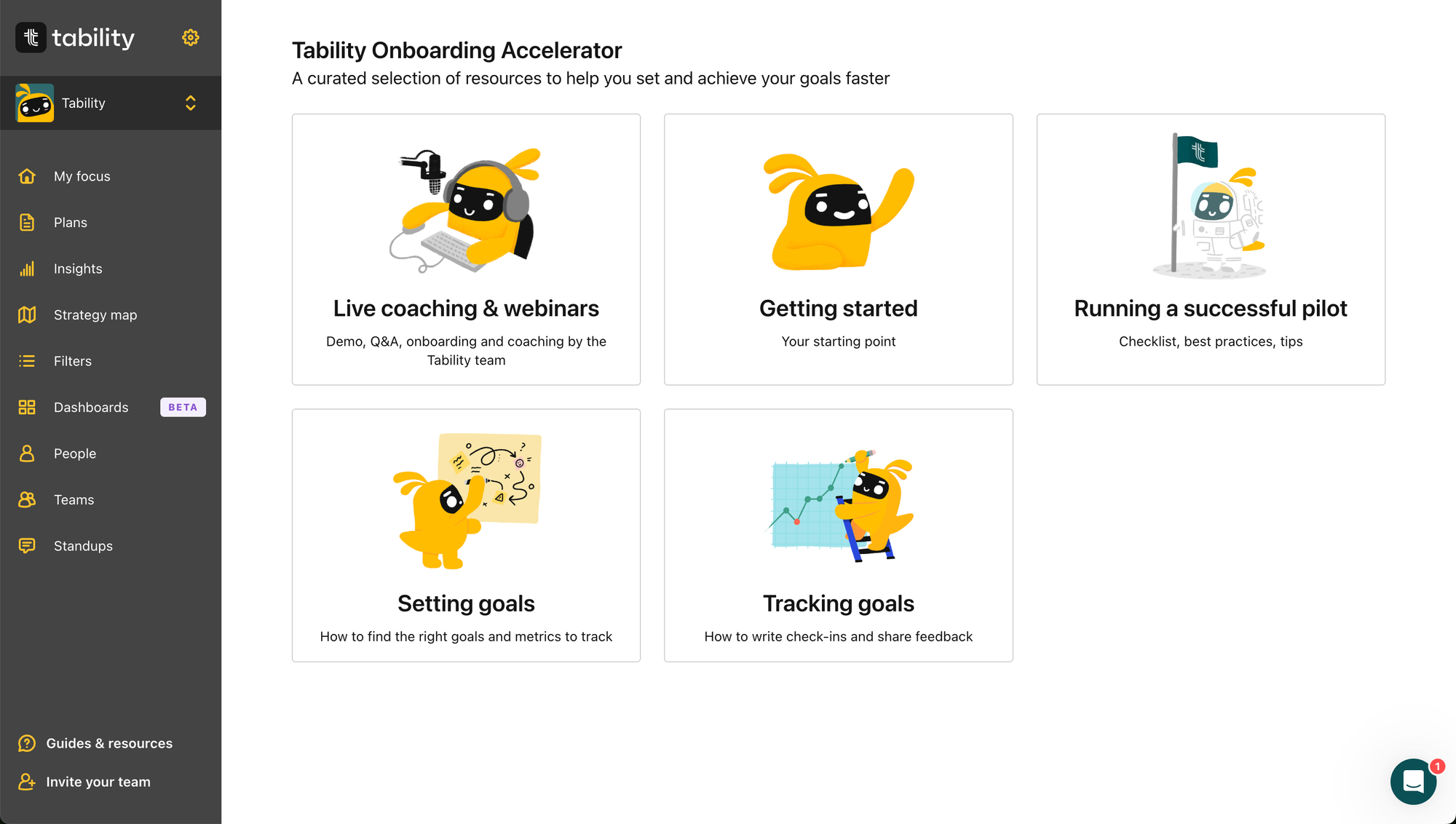 We've taken all the best practices and brought them straight into Tability for your convenience. The Tability Onboarding Accelerator is your one-stop shop for not only learning how to set up and use Tability, but also for teaching you about the practices and processes that will help you be successful outside the product.