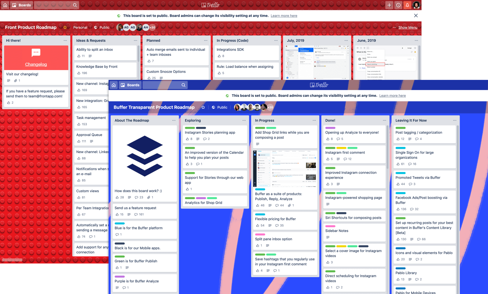 Looking around, we found 2 great examples to follow: Front and Buffer. Both companies are using Trello to communicate what they're working on. They differ in the way they manage released items, but the approach is similar: