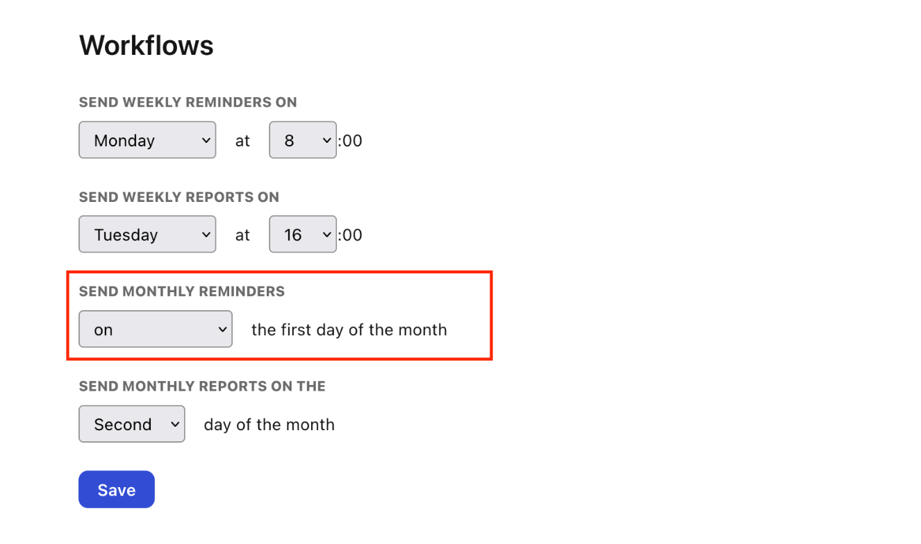There's a new workflow setting available to let you configure when monthly reminders should be sent. You will be able to decide if you want monthly check-ins reminders to happen: