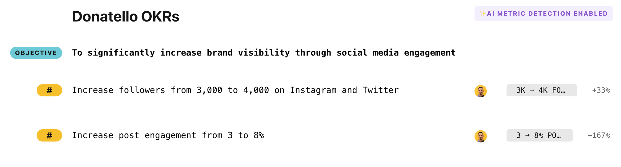 Goals like, "double our social media following from 120 followers" will automatically set a starting point of 120 followers, a target of 240 followers on your goal. If you say, "Increase our NPS rating from 25 to 40," it will recognize NPS as the metric and the values to be starting at 25 and ending at 40.