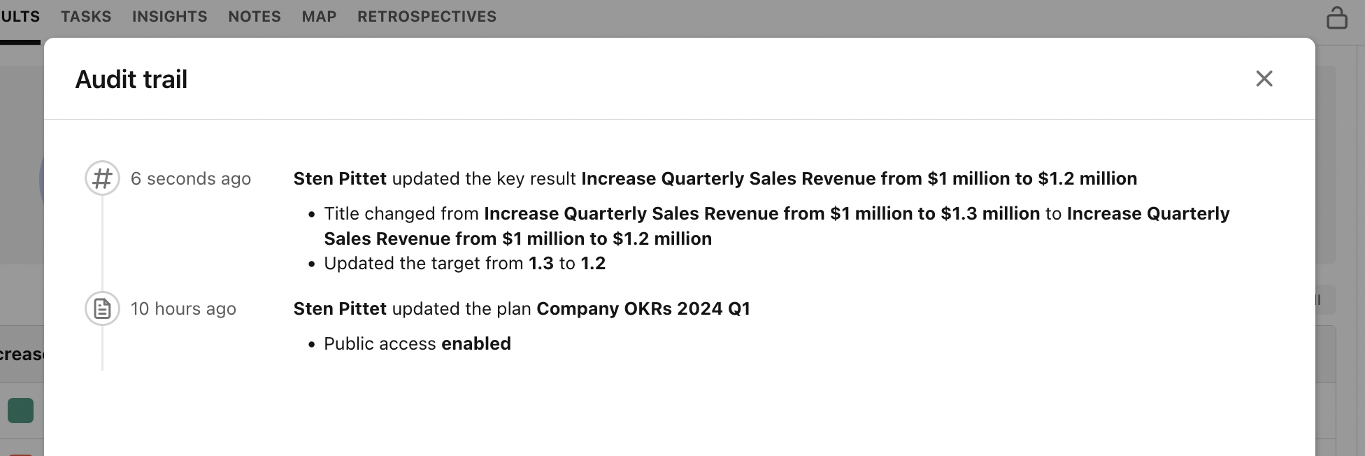 This will allow you to monitor changes to targets, titles, statuses, etc. It can help you restore goals to a previous state, or find out who previously modified an agreed goal.