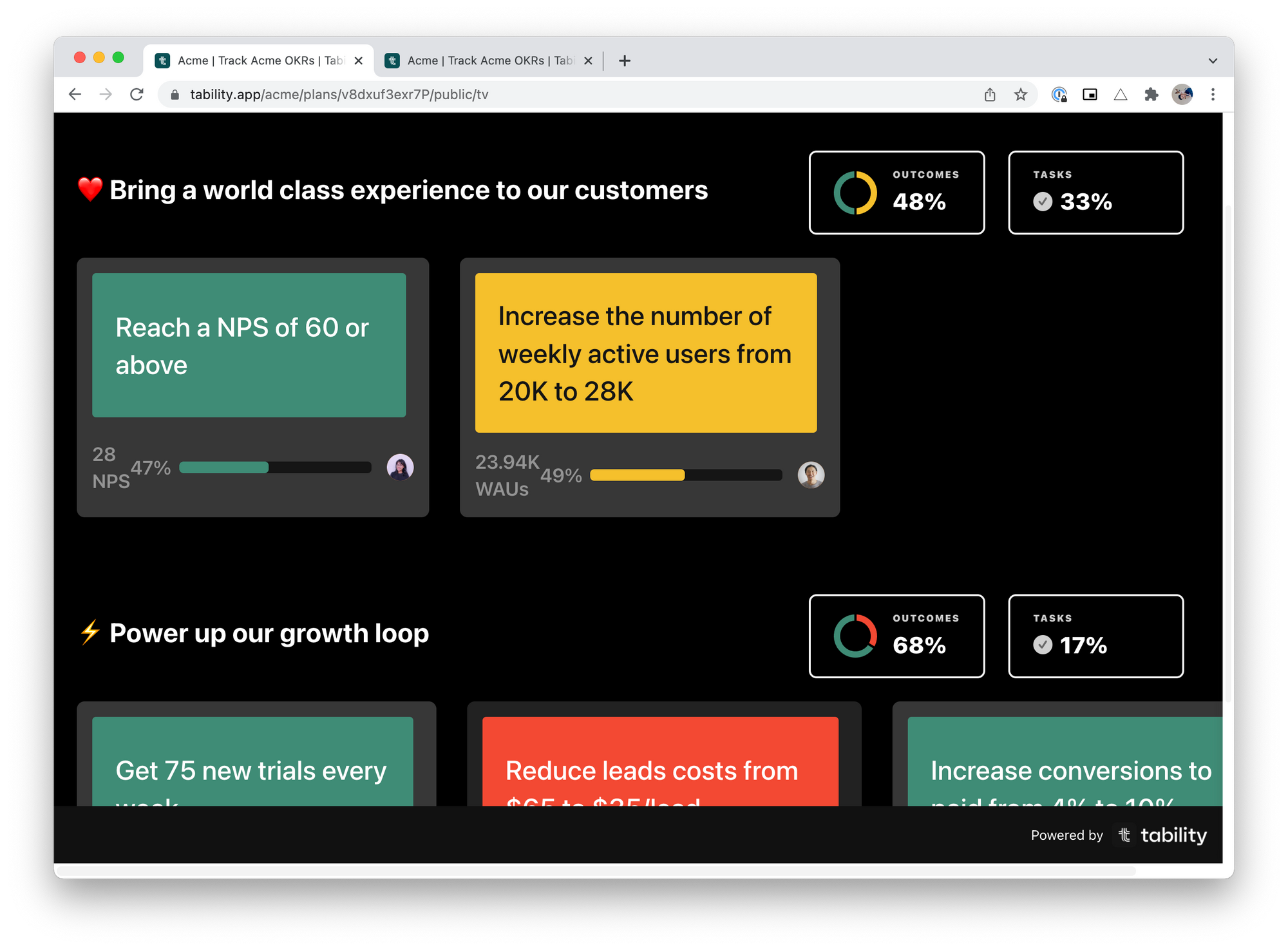Of course this isn't just limited to TVs – if you're just looking for a more visual way to display your OKRs in a meeting, or to use in a presentation, this view can come in handy as well.