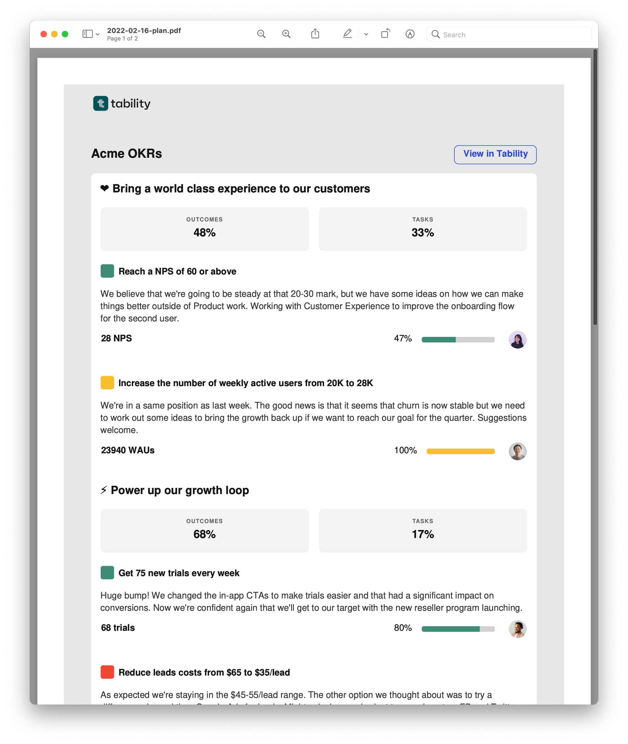 Tracking OKRs is great, but we all know there will come a day when you need to share that progress with your boss, other teams, leadership, or maybe someone outside the org. We've made it incredibly easy to share your Tability plans to just about anybody through different views and file formats.
