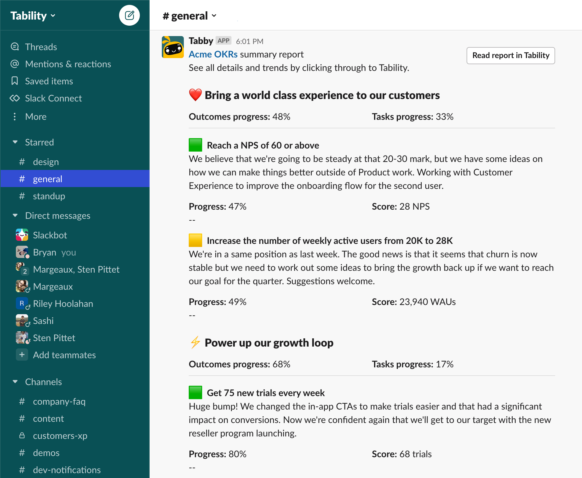 The in-channel reports is a great way to share your progress to your team, or even the entire org automatically.