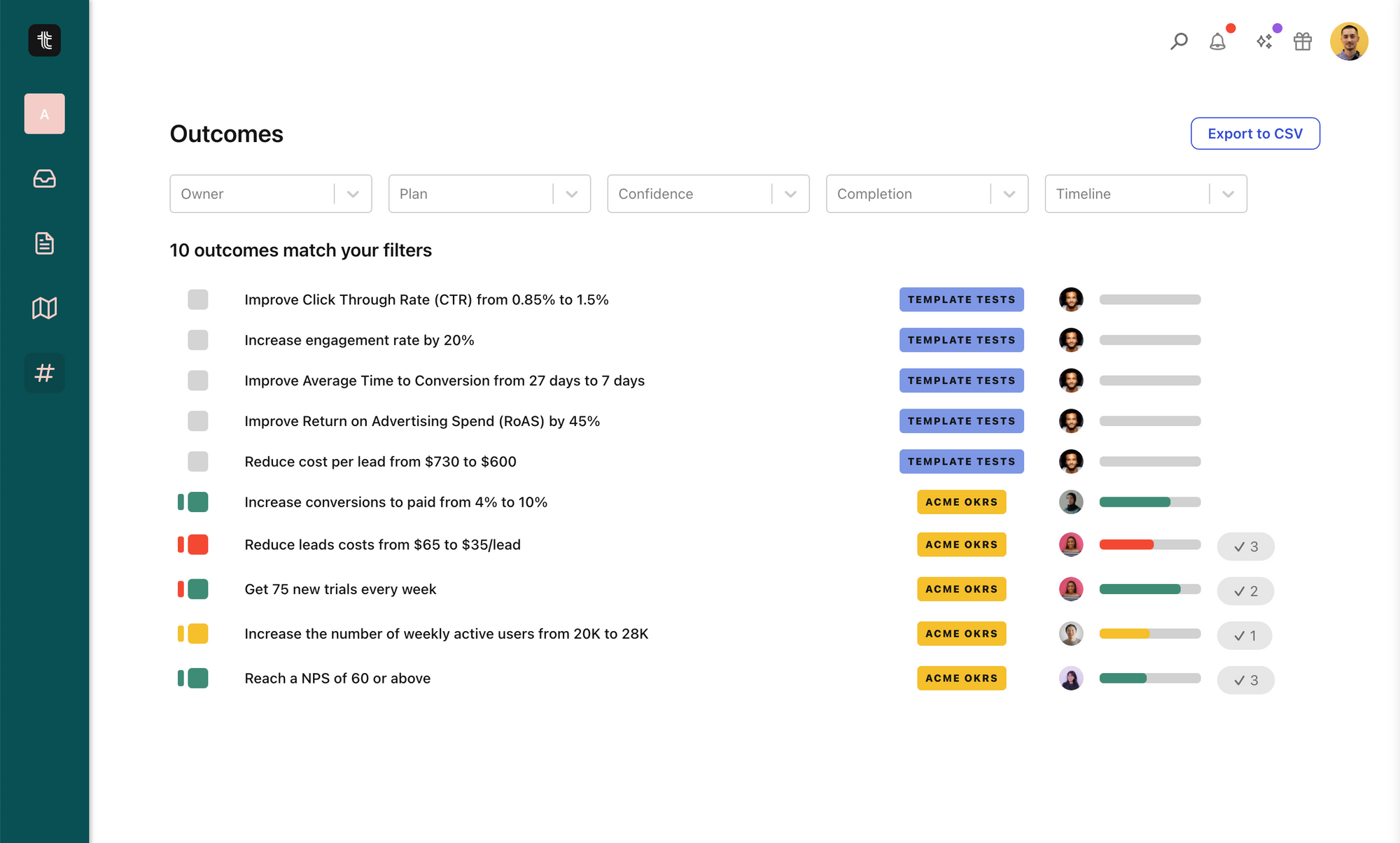 Using our Outcomes view, you can see all the outcomes and key results across the entire workspace. Using the filters, you can easily filter the results by things that you care about. Are you having a 1:1 with Bill? Let's pull up just Bill's outcomes. Looking for just the things that are in the red? We can filter by that too.