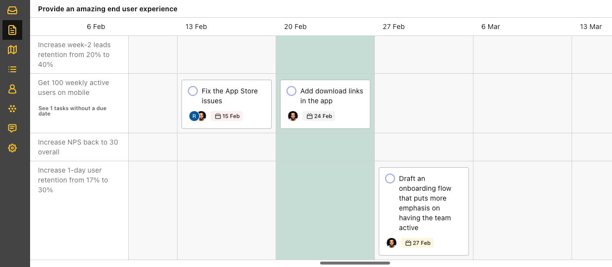There's a new view switcher in the initiatives tab of your plan that allows you to display a weekly timeline for your initiatives.You'll be able to move initiatives around to change their due date, and see how they line up during the quarter.
