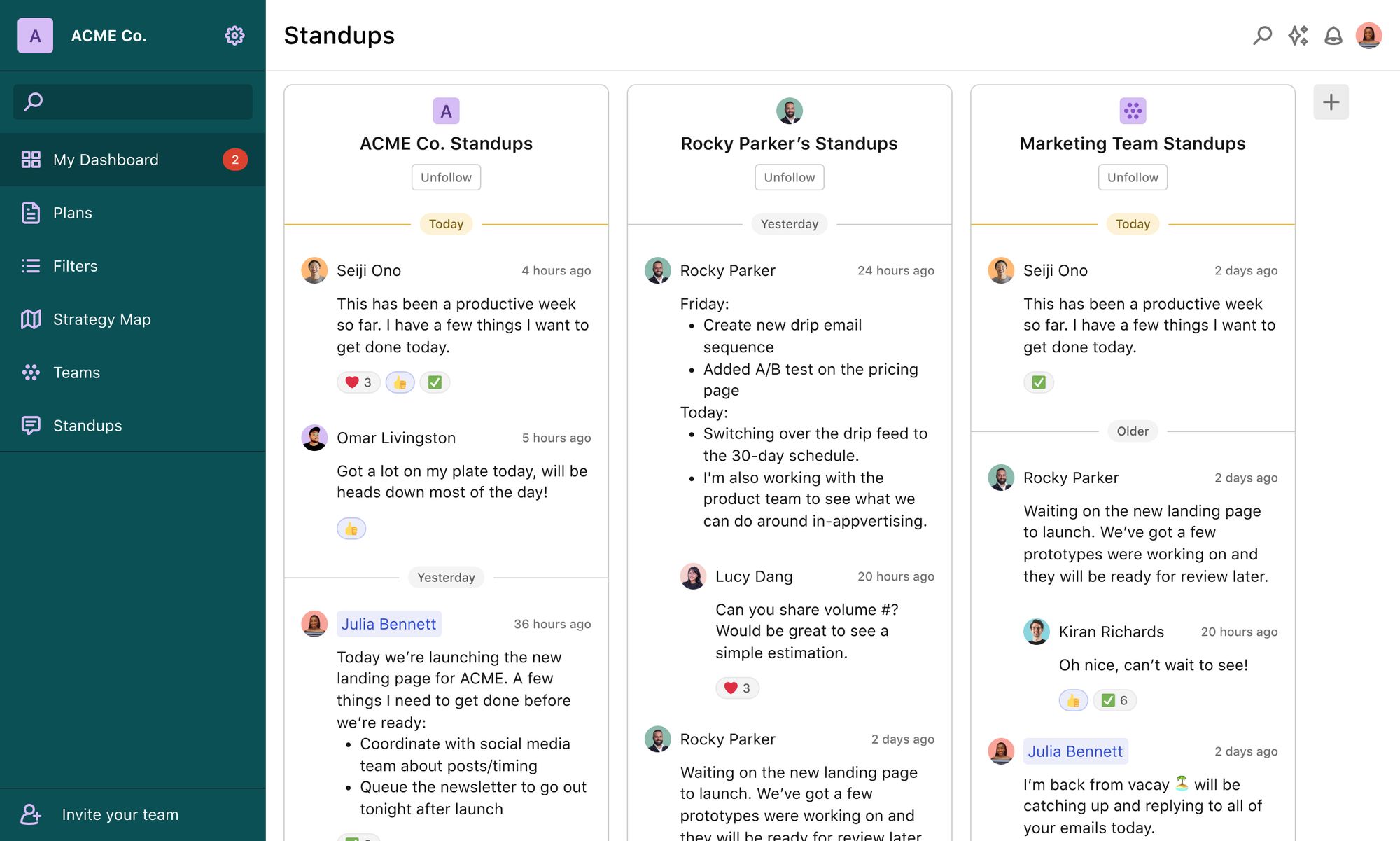 This week, we're excited to introduce a few new features that aim to help you keep your team on track and working at their best. Our new Standups feature enables your team to share more granular updates on what they're working on and where they might be struggling. Meanwhile, our new Weekly Timeline view for initiatives gives you a bird's eye view of what everyone is working on in the coming weeks.