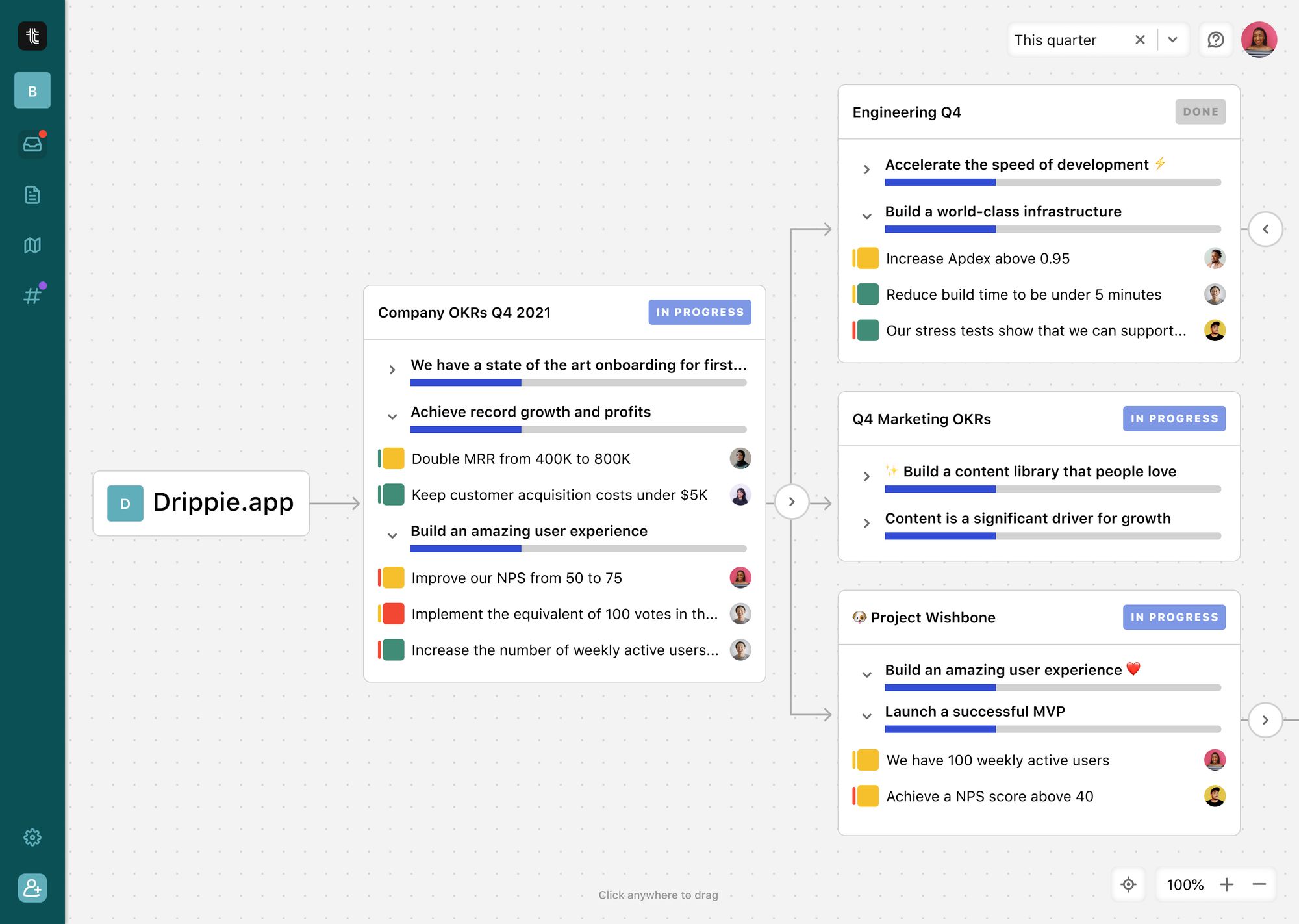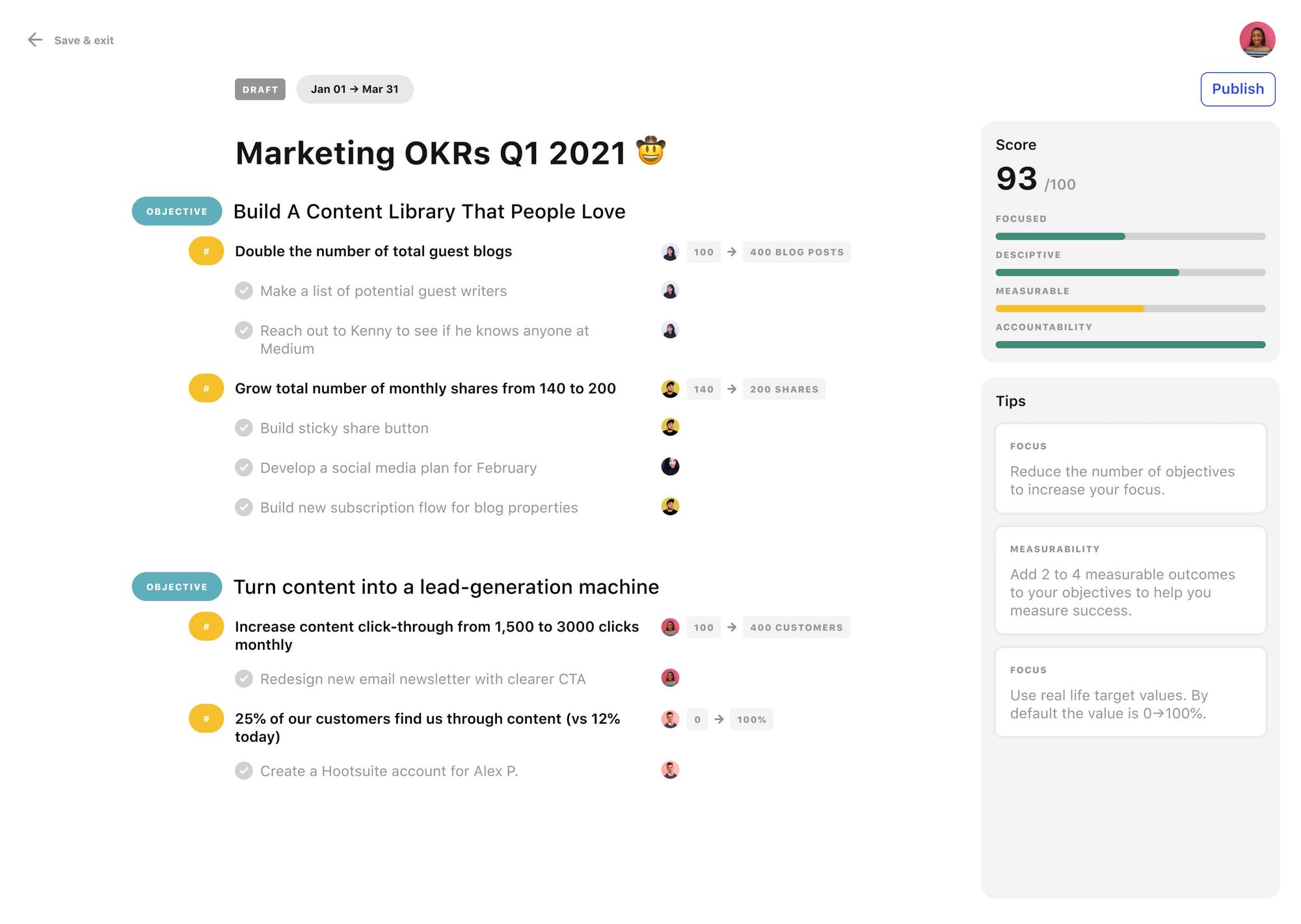 Our templates library features OKR examples that are used in real life. You can browse through them to see how OKR pros structure their plans, how they write their objectives, and what kind of metrics they track.