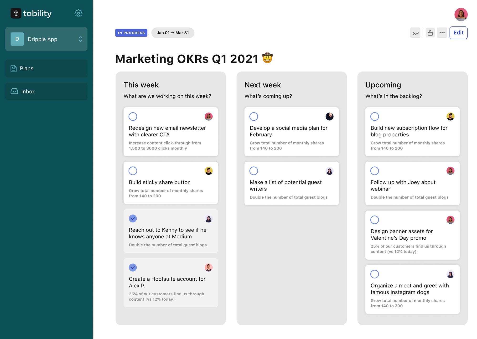 Tability doesn’t exist without it’s check-ins. It’s the key to turning your OKRs from a dusty old page to the masterplan that drives the success of your business. Doing regular check-ins makes sure that you’re keeping your main objectives top of mind and correcting course if needed.